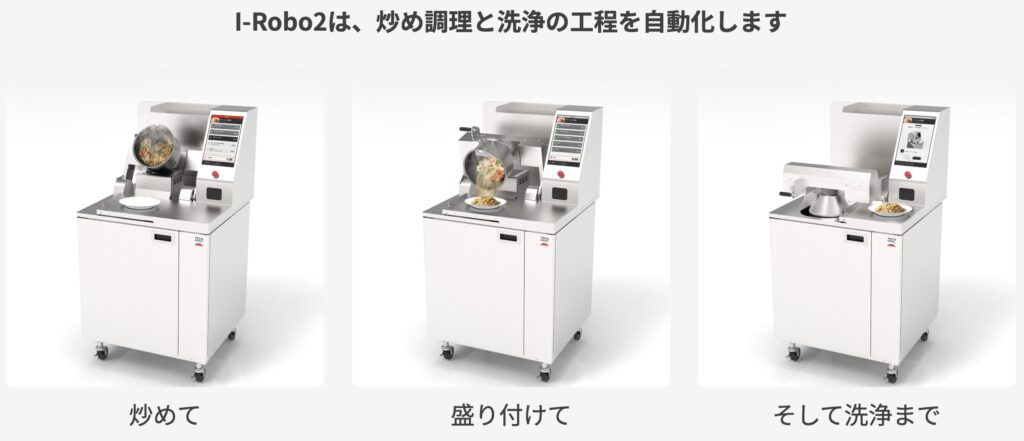 - 主力製品: I-Robo2という次世代炒め調理ロボット。炒め調理、盛り付け、鍋洗浄を1つの鍋で一気通貫に自動化。温度・時間・鍋/ヘラの回転を制御して、職人の味を再現。